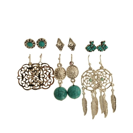 6 Pair Silver Tone and Turquoise Dream Catcher Multi Drop and Stud Earrings